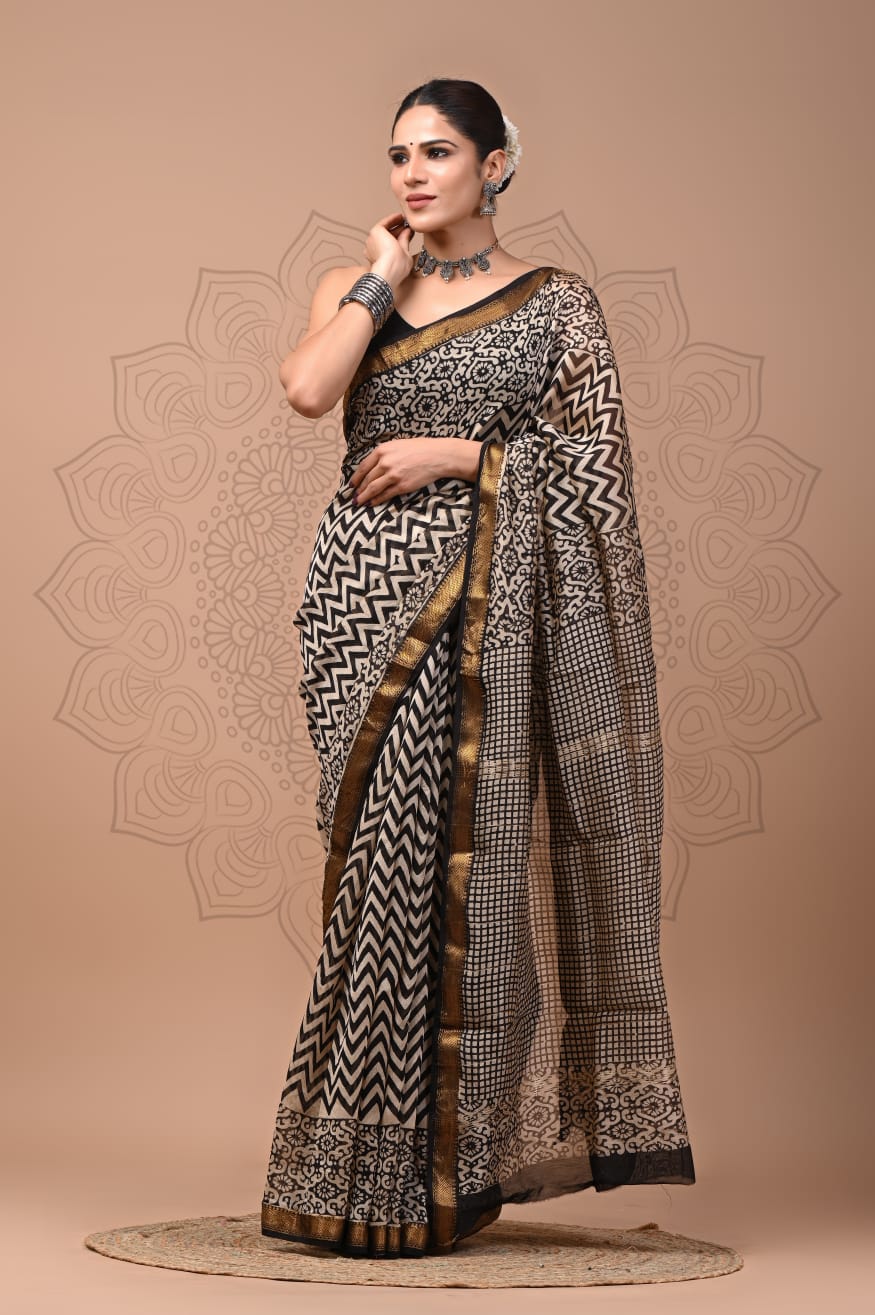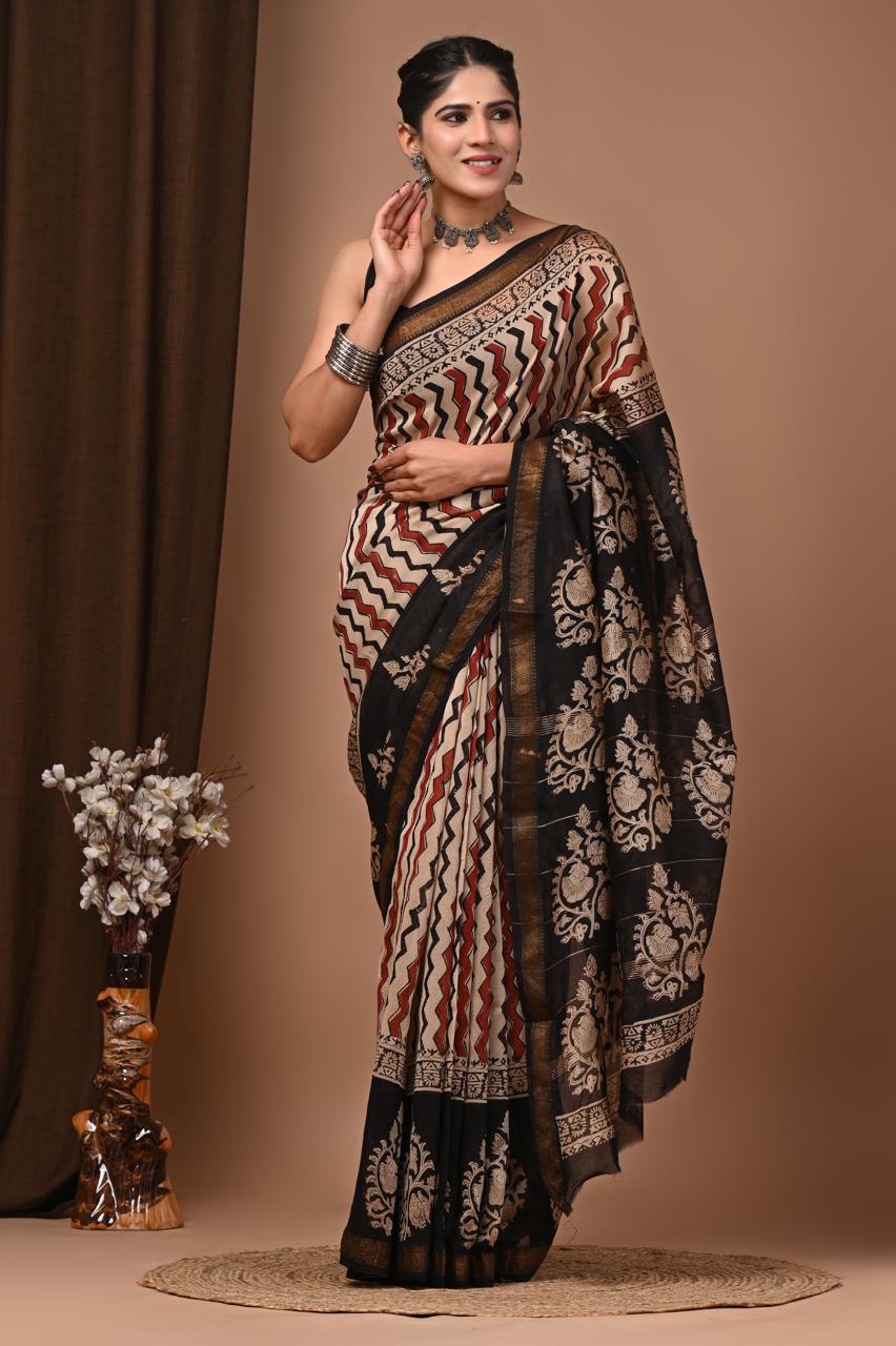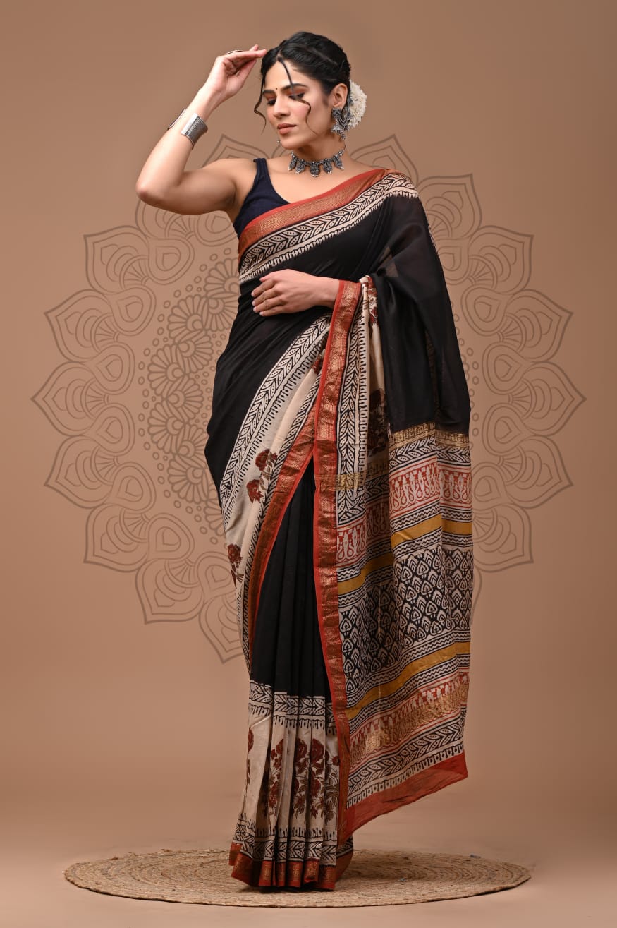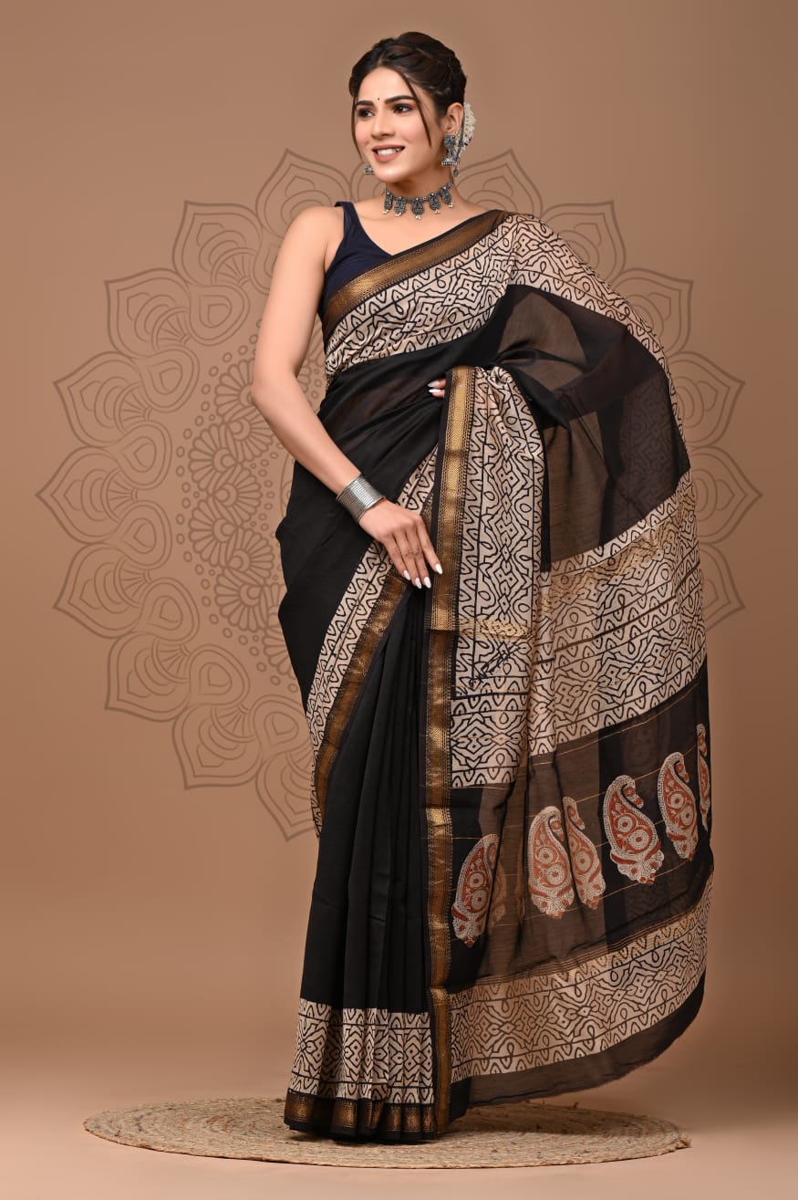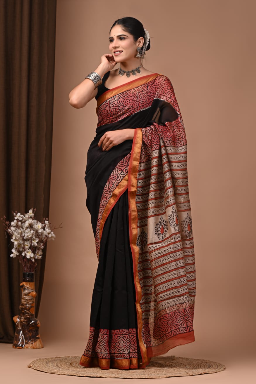 Beautiful Pure Maheshwari Traditional Hand Black Printed Silk Sarees