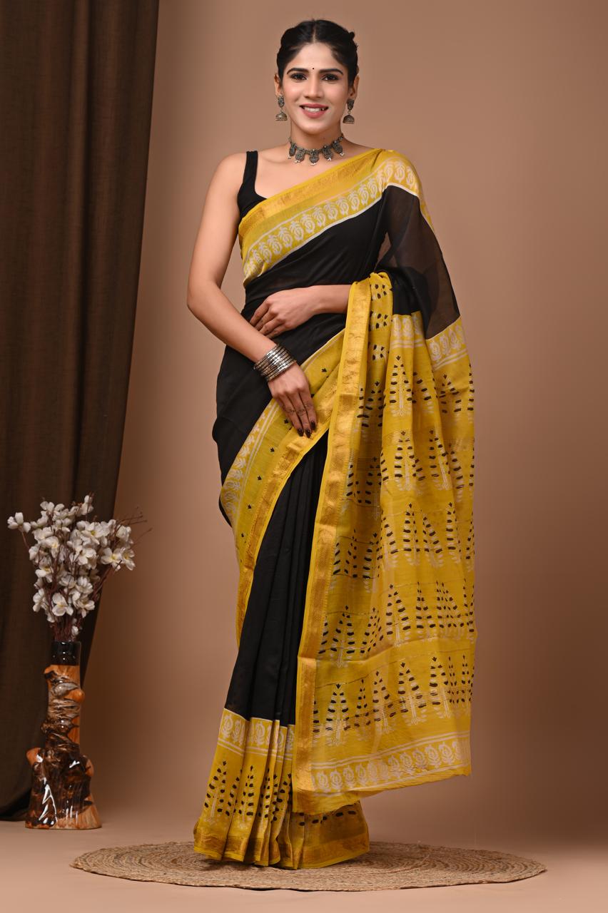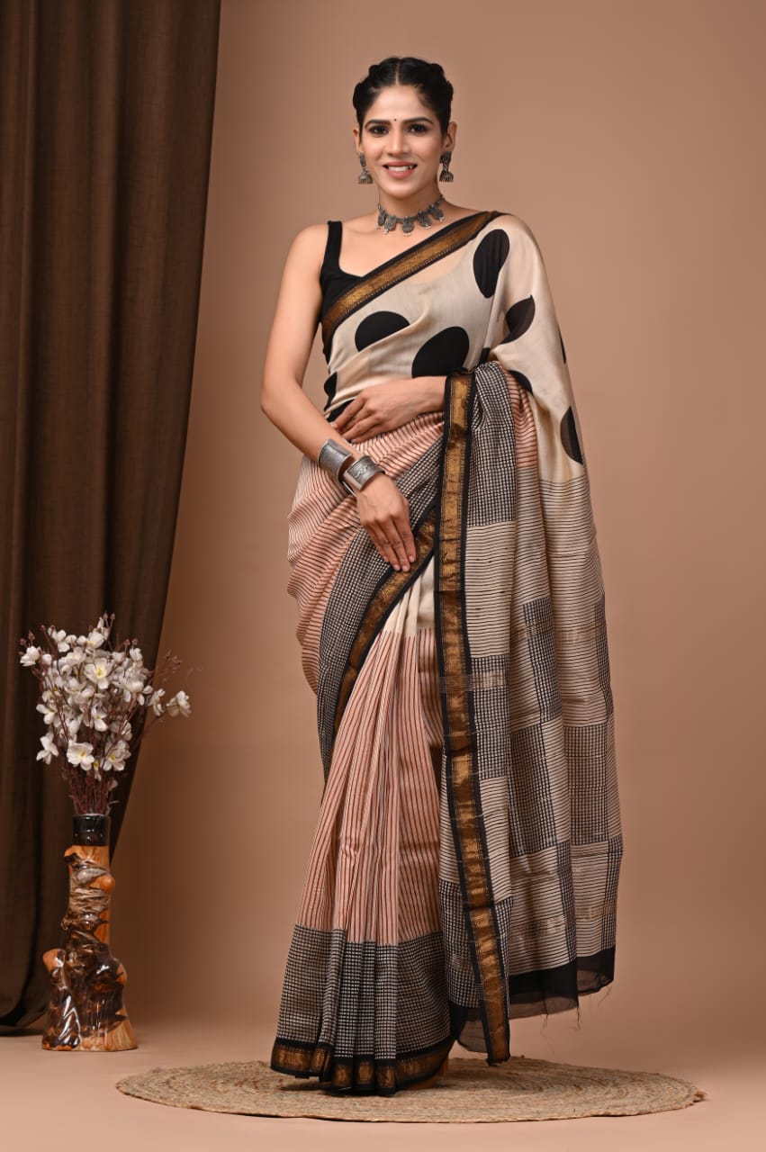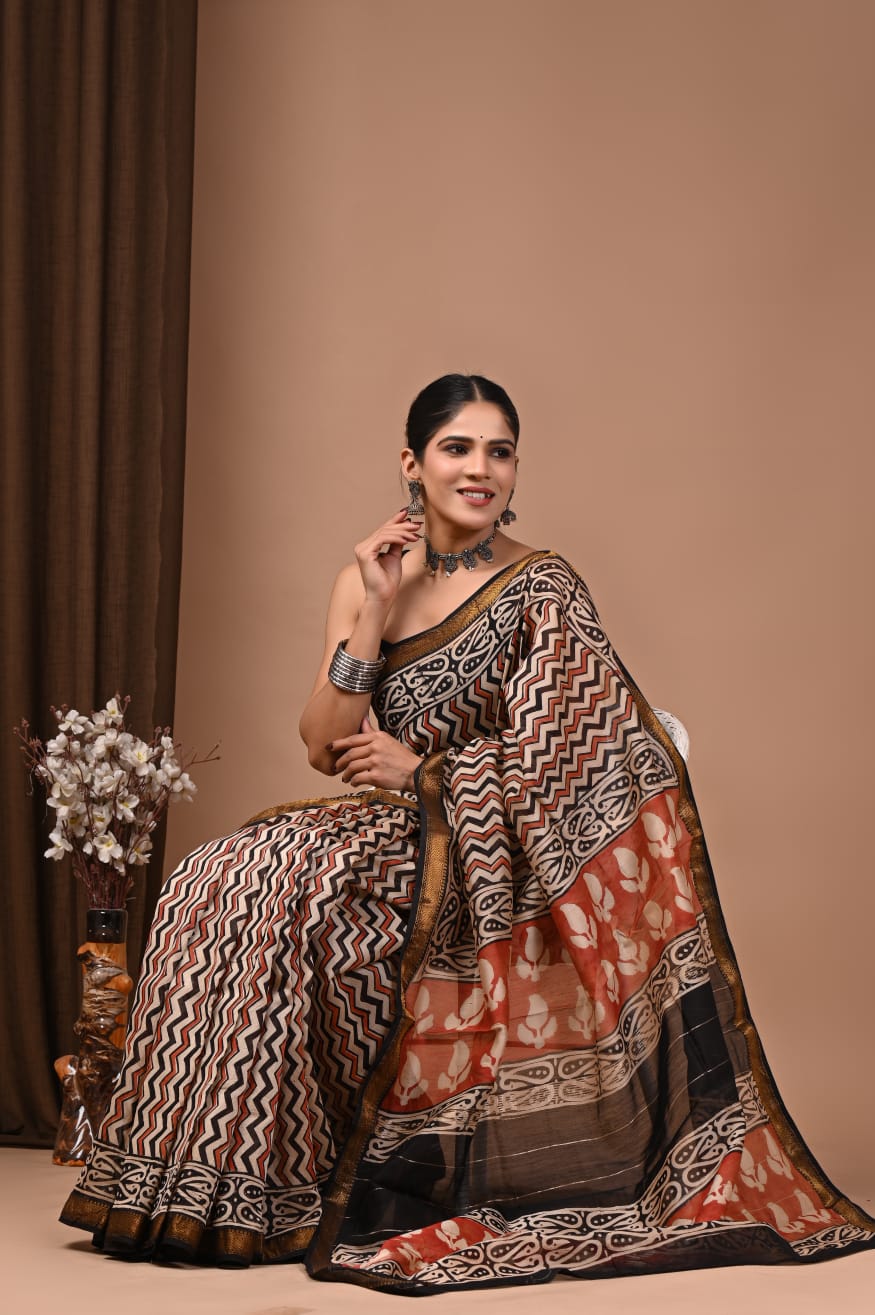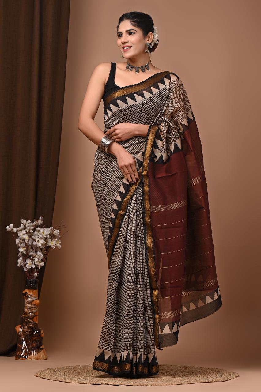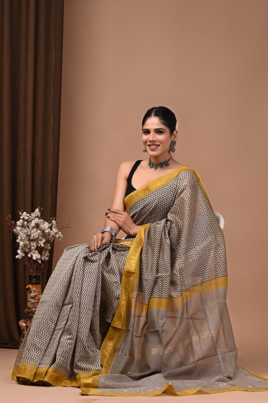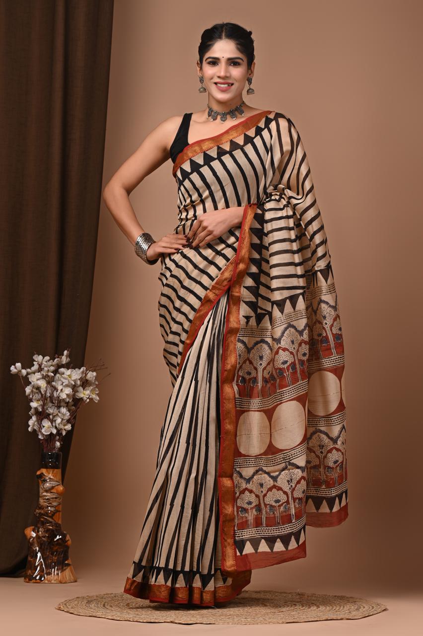 Beautiful Pure Maheshwari Traditional Hand Black Printed Silk Sarees