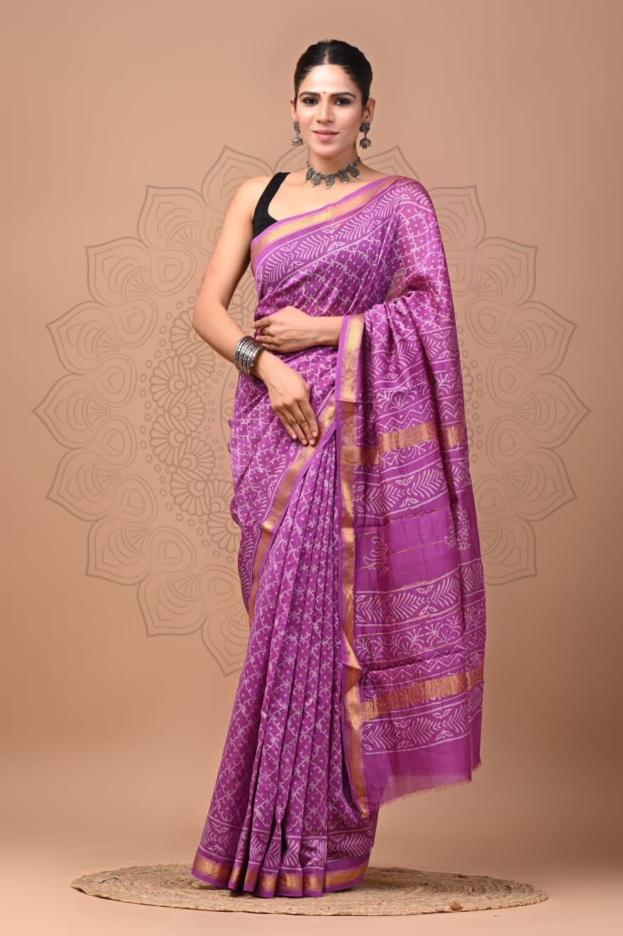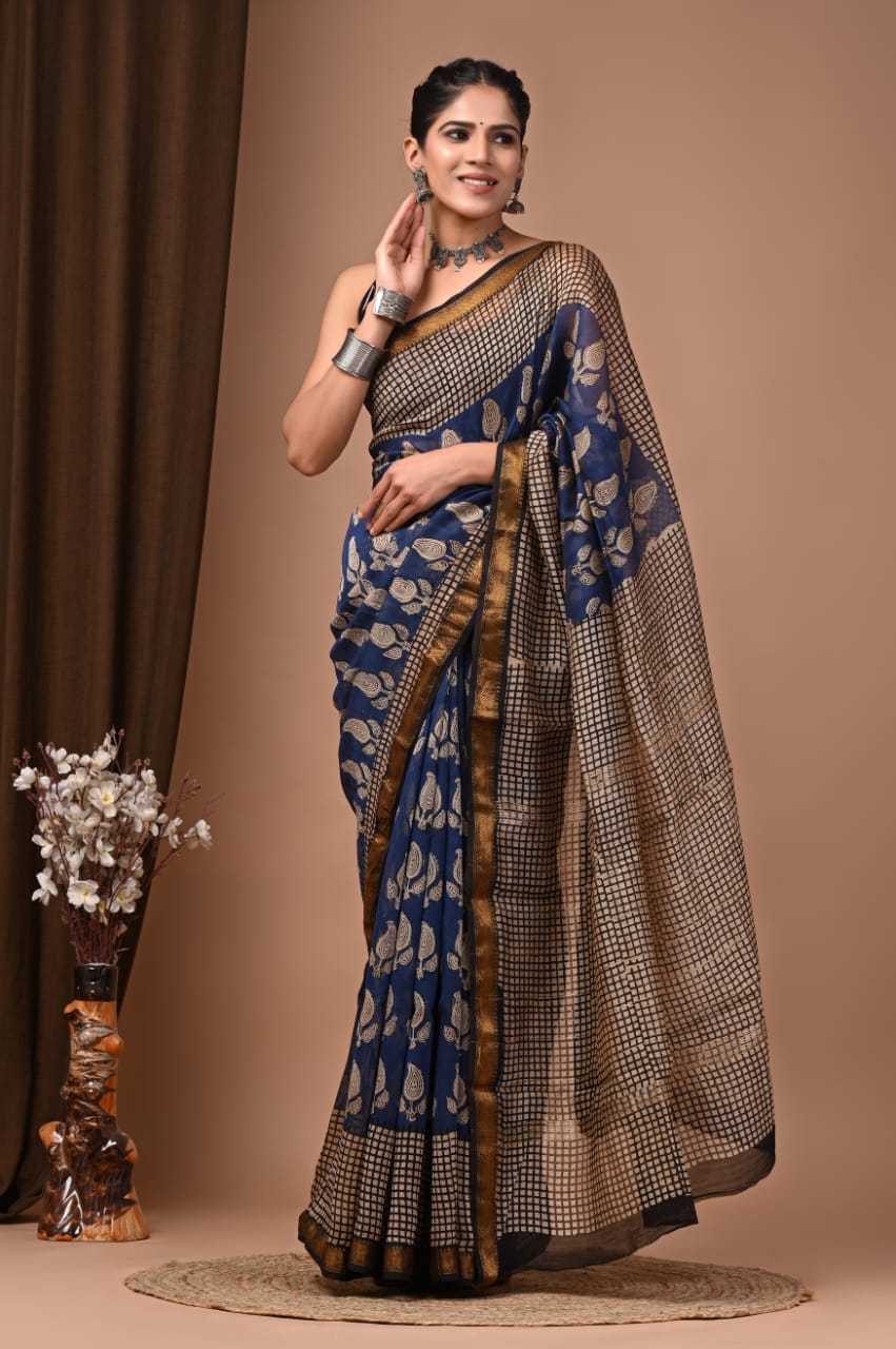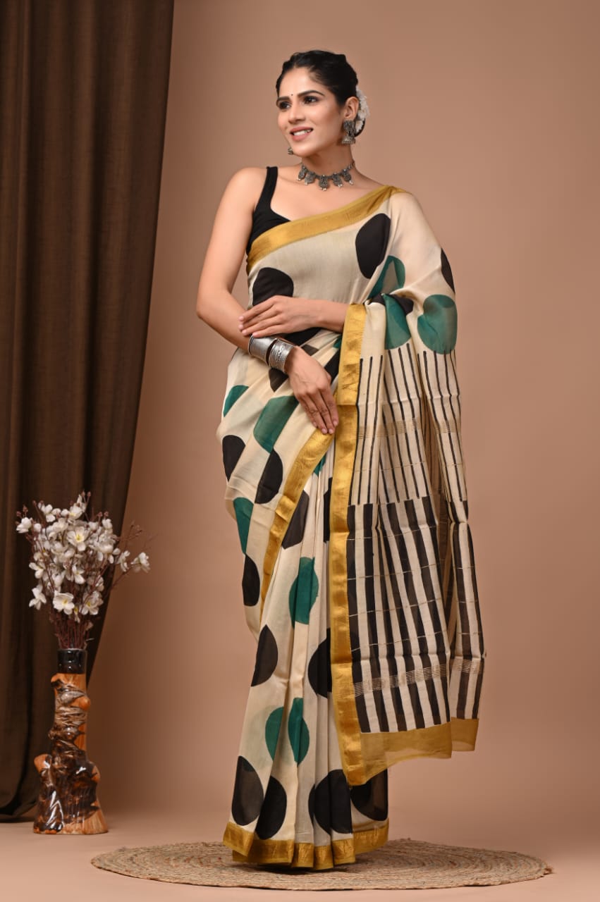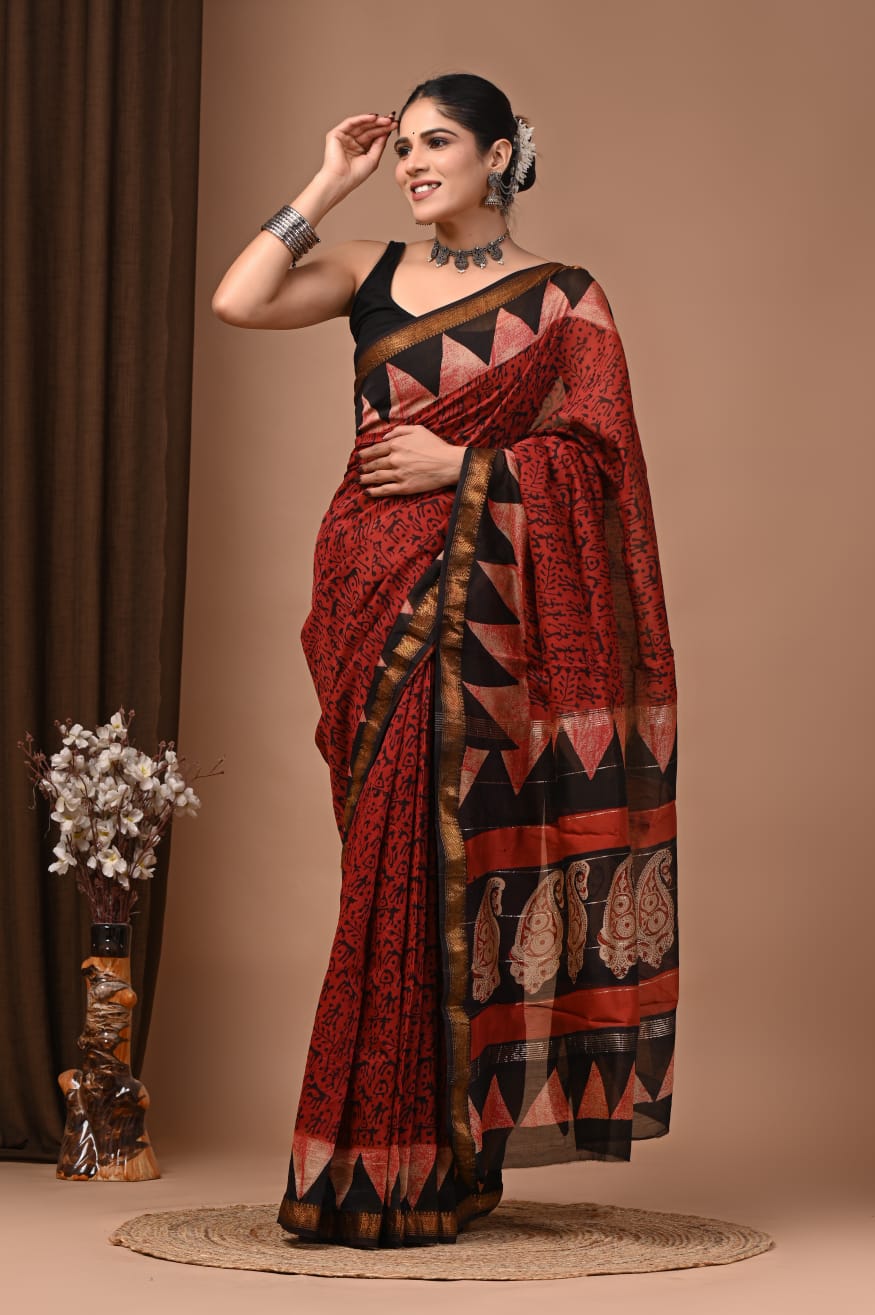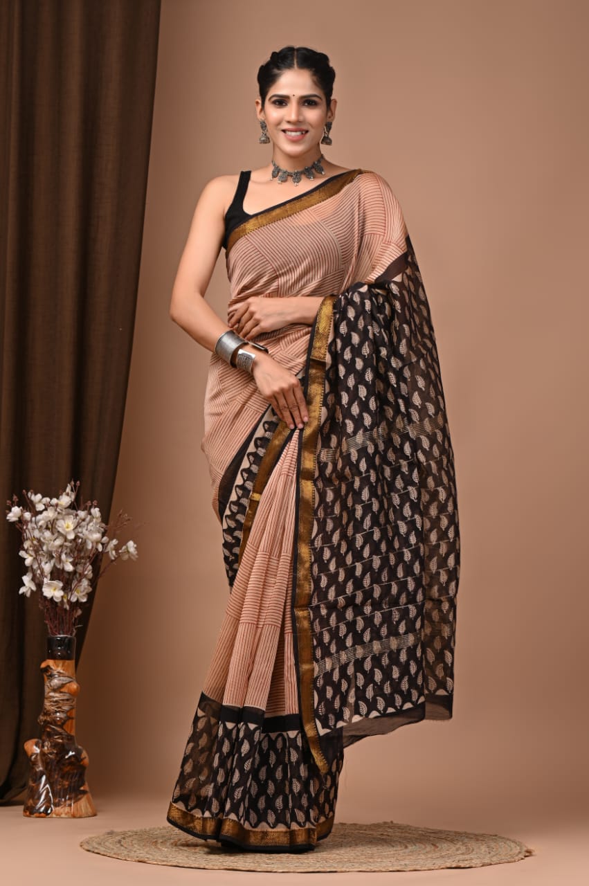 Beautiful Pure Maheshwari Traditional Hand Black Printed Silk Sarees
