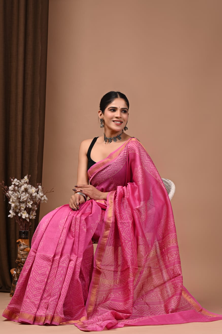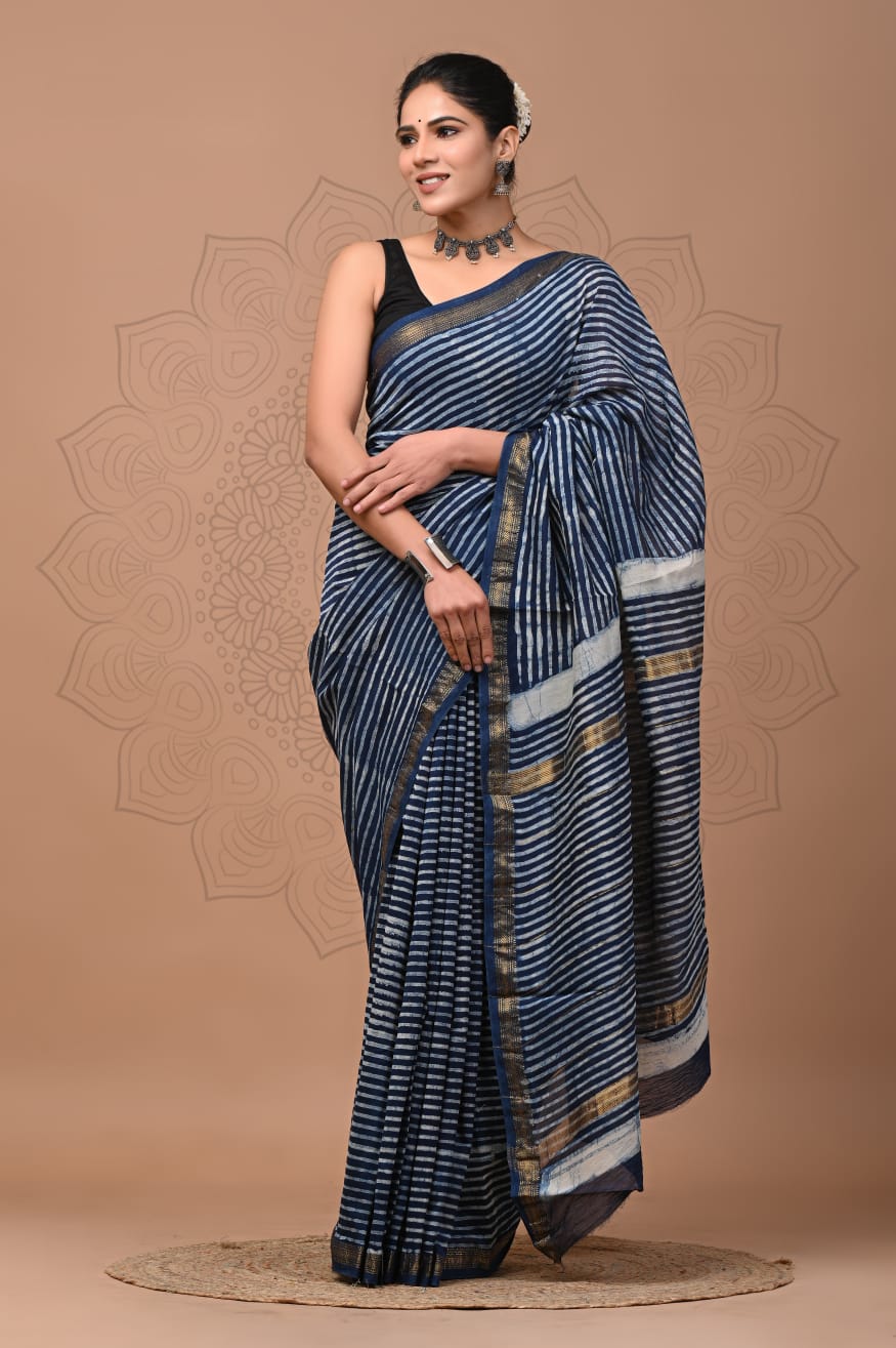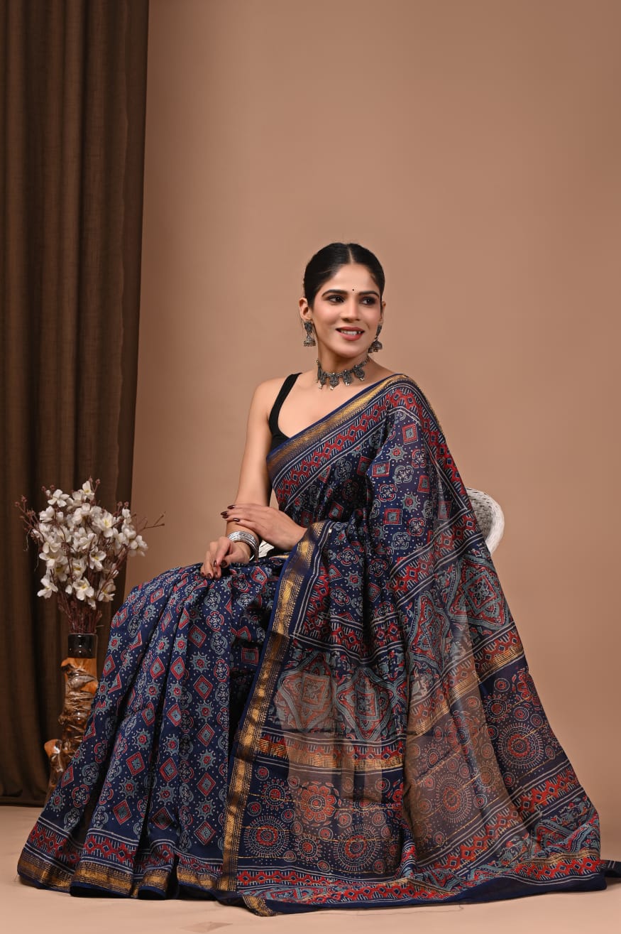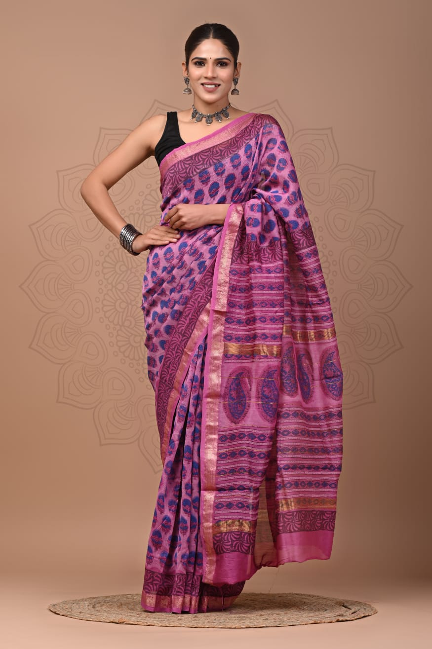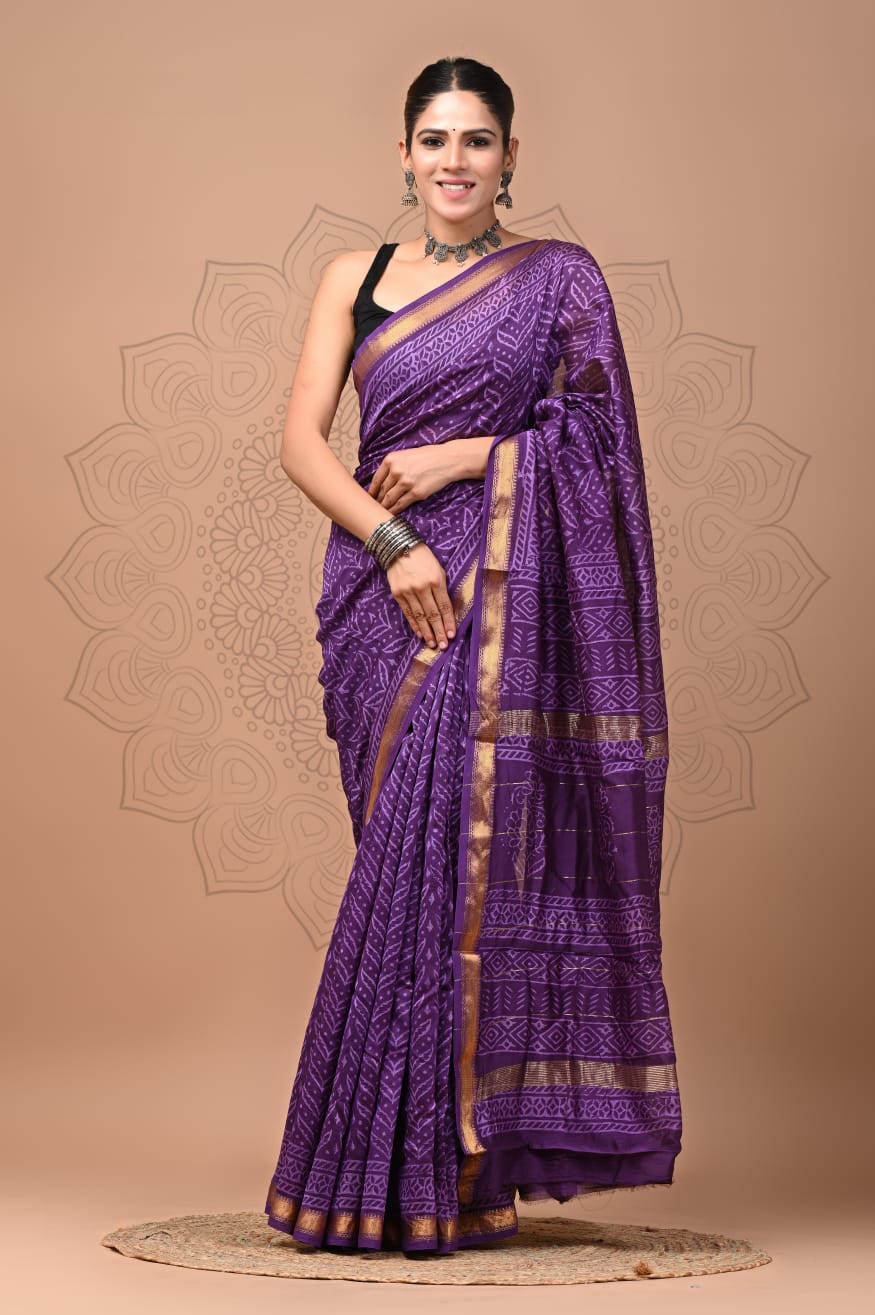Beautiful Pure Maheshwari Traditional Hand Black Printed Silk Sarees